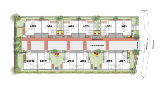 Using different colours of concrete to enchance and visualise pedestrian path while maximising safeness for residents within the site.